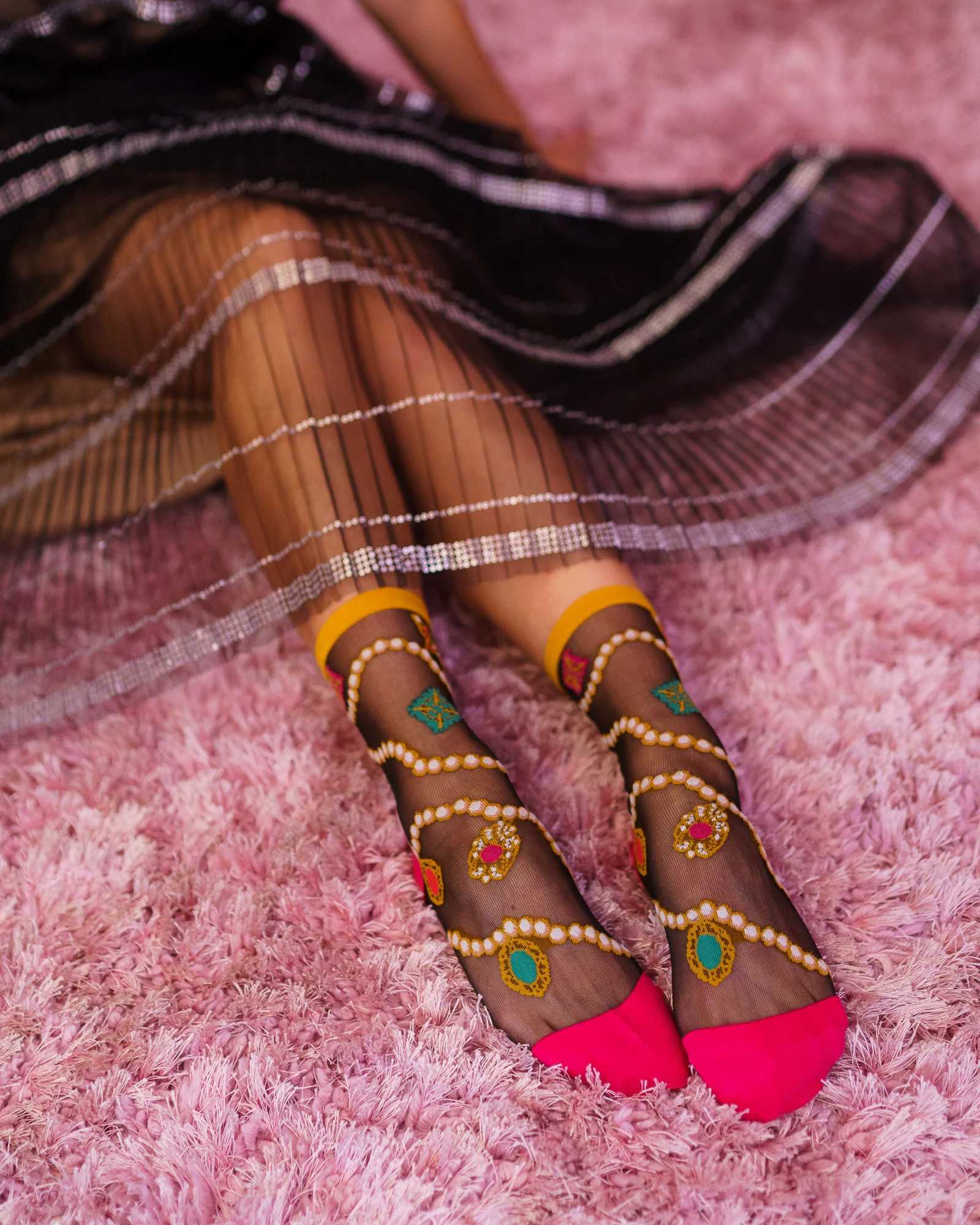 Adorn your feet with luxe pearls and vintage jewels for fancy nights out. Set against a black sheer fabric, this is your go-to luxury ankle black sock for pairing with dressy heels for an unforgettable look.Â